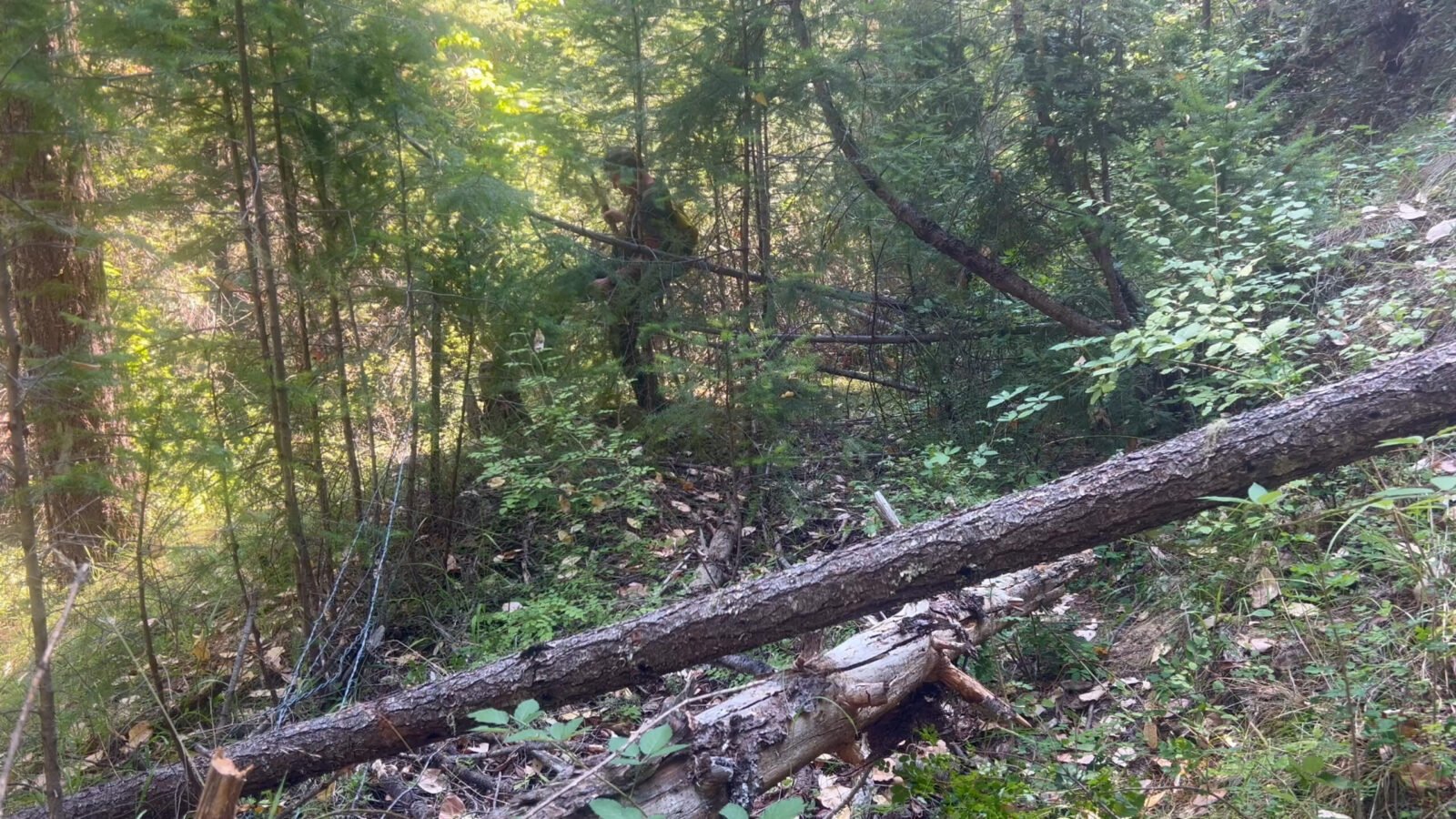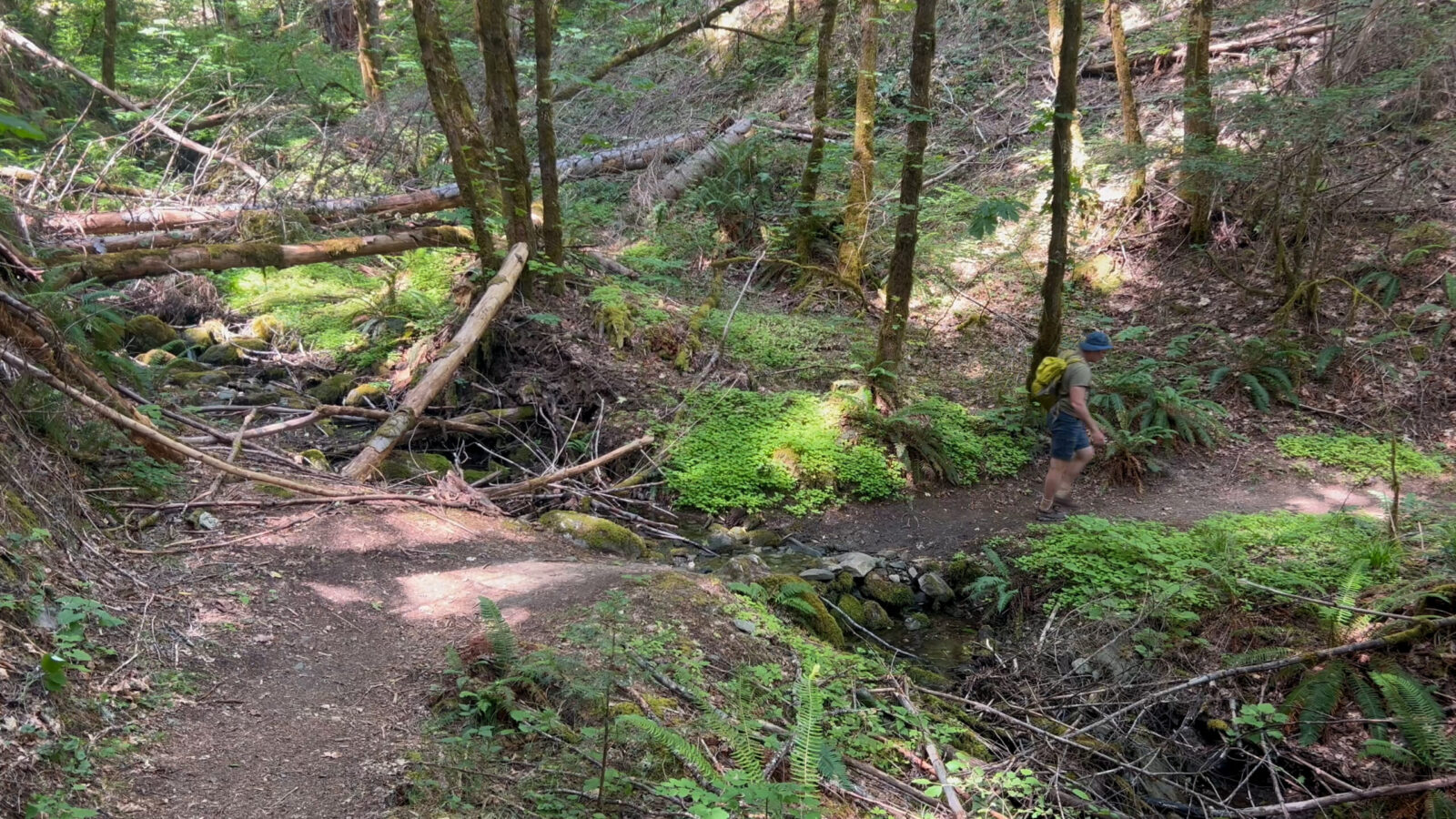 At the 4 mile spot the trail begins to leave the lakeshore. You hit an intersection where an old road heads to your left. Totally overgrown. Only an idiot would try it! Three, two, one, okay we tried it. So many big tree falls and giant patches of blackberries and brushy overgrowth. We did maybe 1.5 miles and finally admitted defeat. However, this is a fine place to turn around for a nice 8 mile out and back.